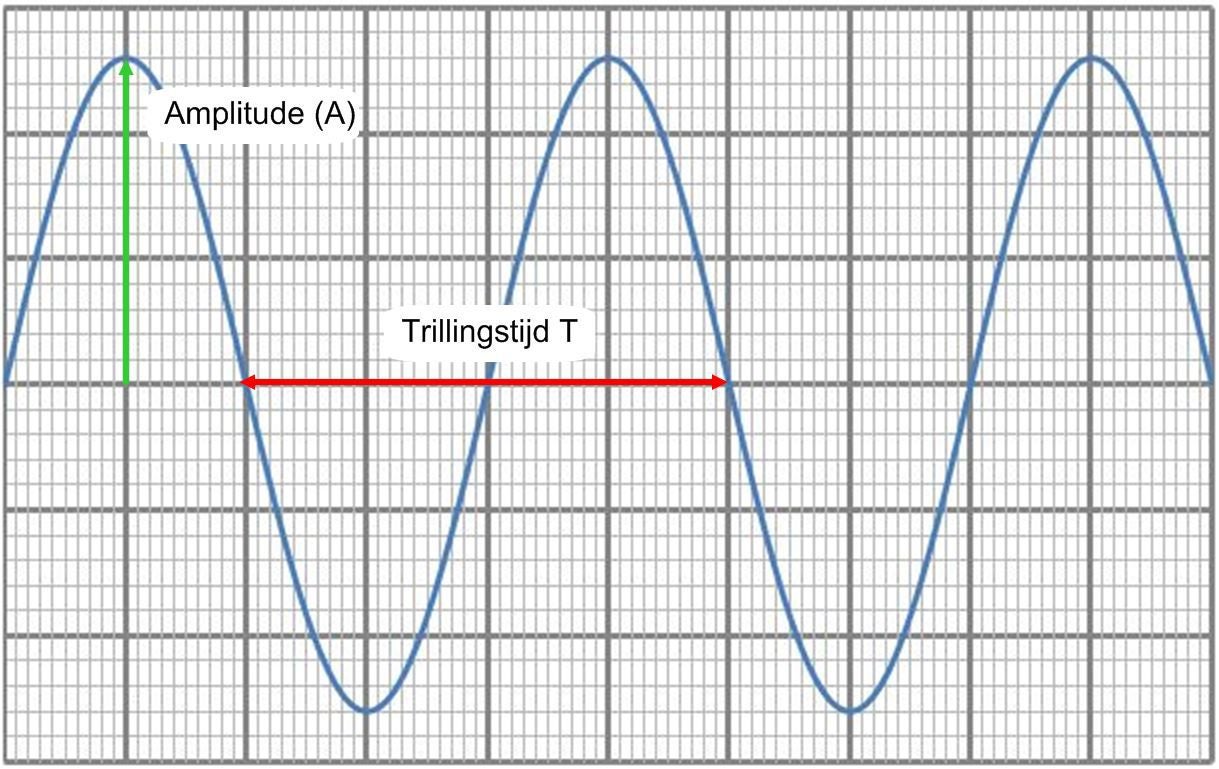 Je kunt ook een heel aantal trillingen nemen, bijvoorbeeld 2 trillingen. In het voorbeeld zijn dat 8 hokjes. Soms zul je niet op een mooi aantal hokjes uitkomen, lees dan zo goed mogelijk af (bijv. 7,3 hokjes). Neem wel altijd een heel of half aantal trillingen!